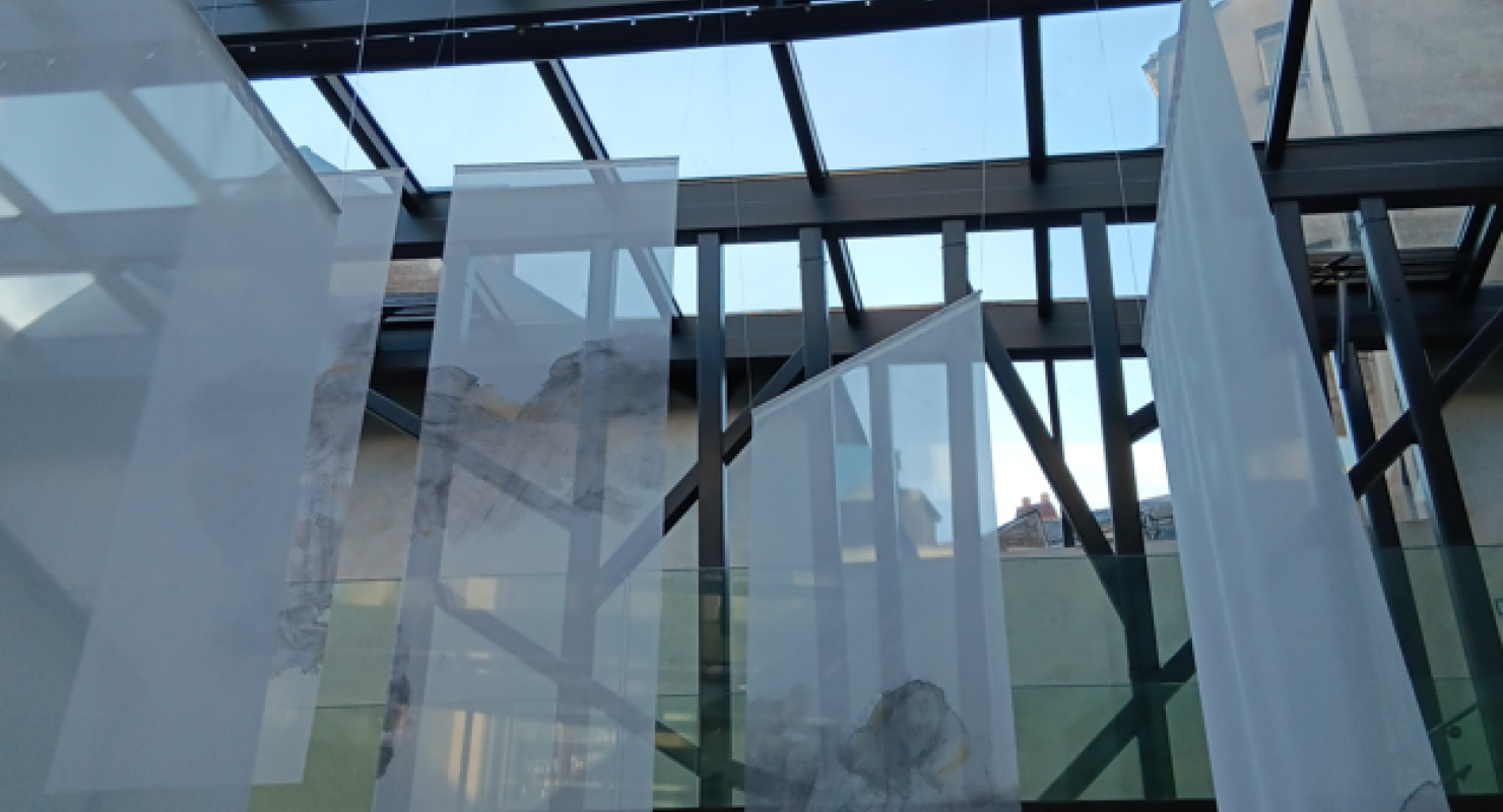 Les anges occupent l'espace dans la 1ère salle d'exposition : photographiés, dessinés, agrandis, aquarellés, imprimés sur voile suspendu...