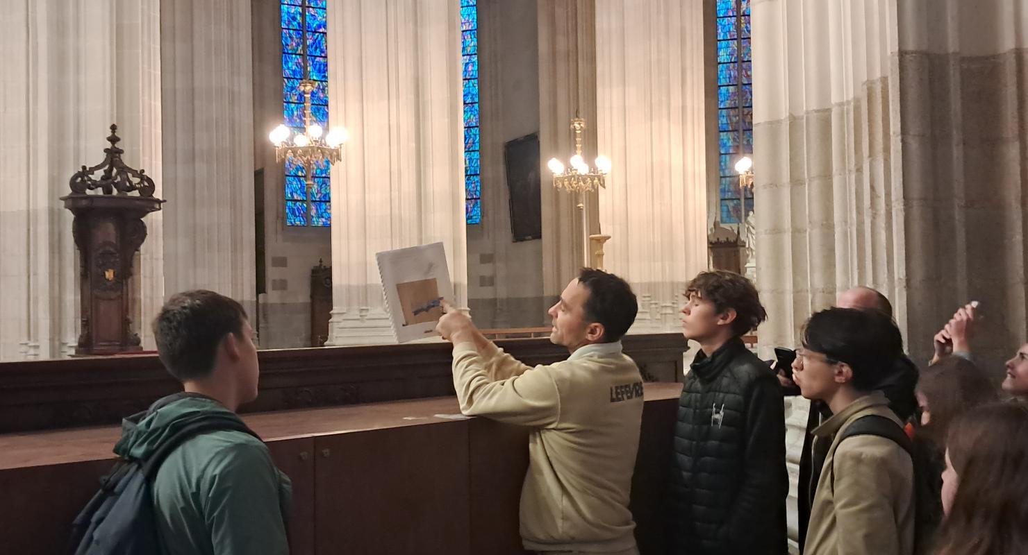Tristan a brillamment initié ses camarades de classe à la complexe lecture d'une des façades, avant d'entrer dans la cathédrale pour apprécier le détail de la rénovation des piliers.